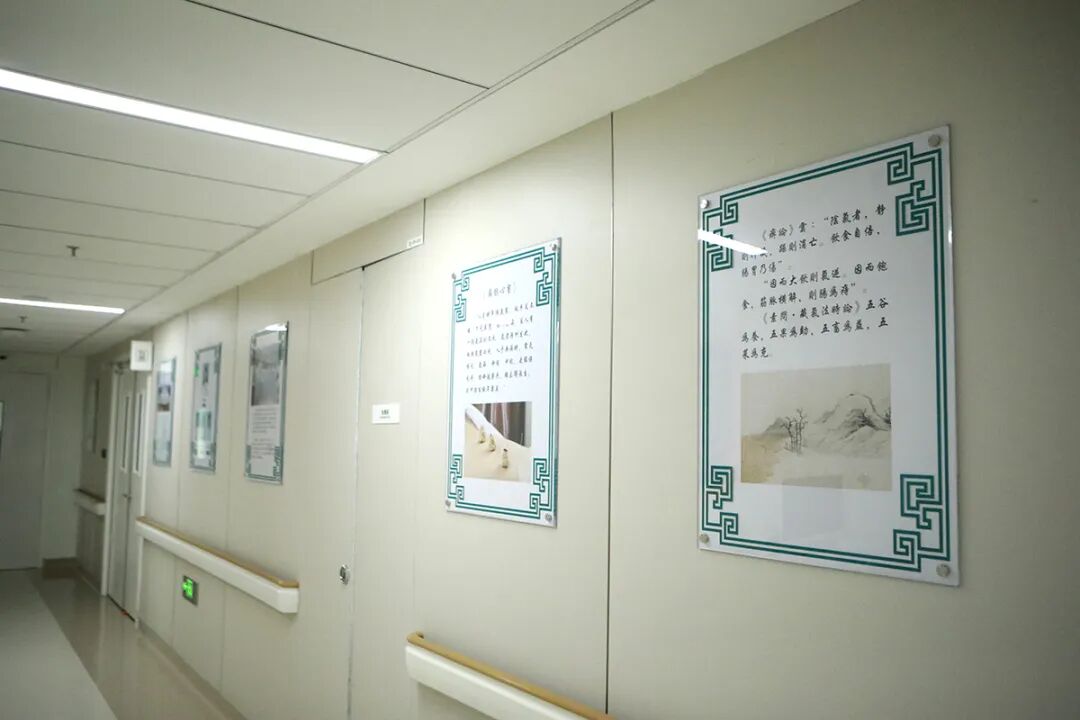 智谋中西医皆集病房走廊吊挂中医文籍名句。
