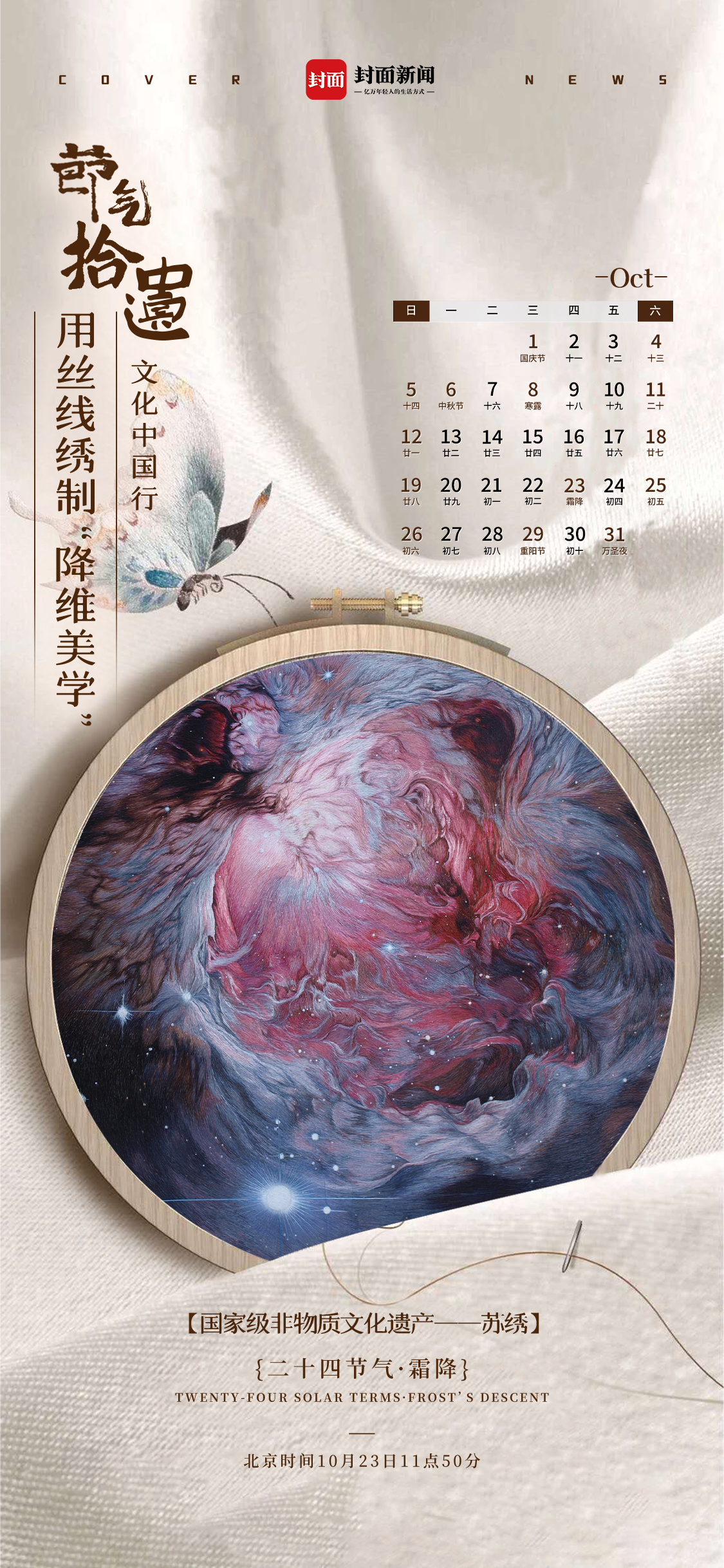 海报缱绻 王想祺 封面新闻记者荀超 10月23日,当太阳到达黄经210度,二十四骨气中的第十八个骨气——霜降如约而至。《月令七十二候集解》:“九月中,气肃而凝,露结为霜矣。”此时,天更冷了,露珠凝结成霜。这个“山明水净夜来霜,数树深红出浅黄”的骨气,与国度级非物资文化遗产苏绣重逢,会碰撞出若何的艺术火花?以针捉刀,以线着色,把星空天地“绣”出来的著名苏绣艺术家陈英华接收封面新闻记者独家专访,用苏绣讲明霜降骨气的创作理念、技法变嫌与文化想考。 时间刺绣 霜降三候恰似刺绣流程 古东谈主将霜降分为三