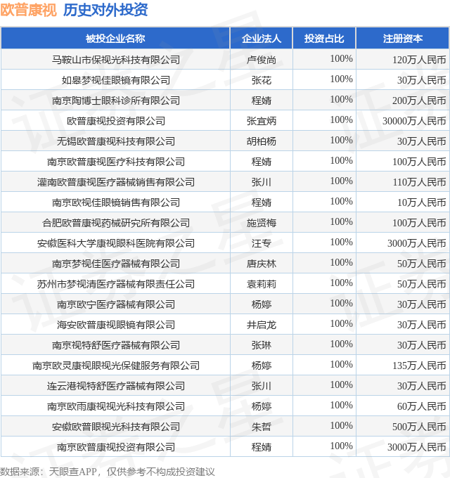 本站音讯,凭证天眼查APP清晰,欧普康视(300595.SZ)新增一齐对外投资事件,被投资公司为马鞍山市保视光科技有限公司,法定代表东谈主卢俊尚,投资占比为100%。该公司从事科技推行和运用办管事,注册老本为120万东谈主民币。当今,欧普康视共存在对外投资91项,投资占比前20的形势见下表: 通过天眼查大数据分析,欧普康视科技股份有限公司共对外投资了117家企业,参与招投标形势195次;财产印迹方面有商标信息182条,专利信息105条,文章权信息26条;此外企业还领有行政许可222个。据202